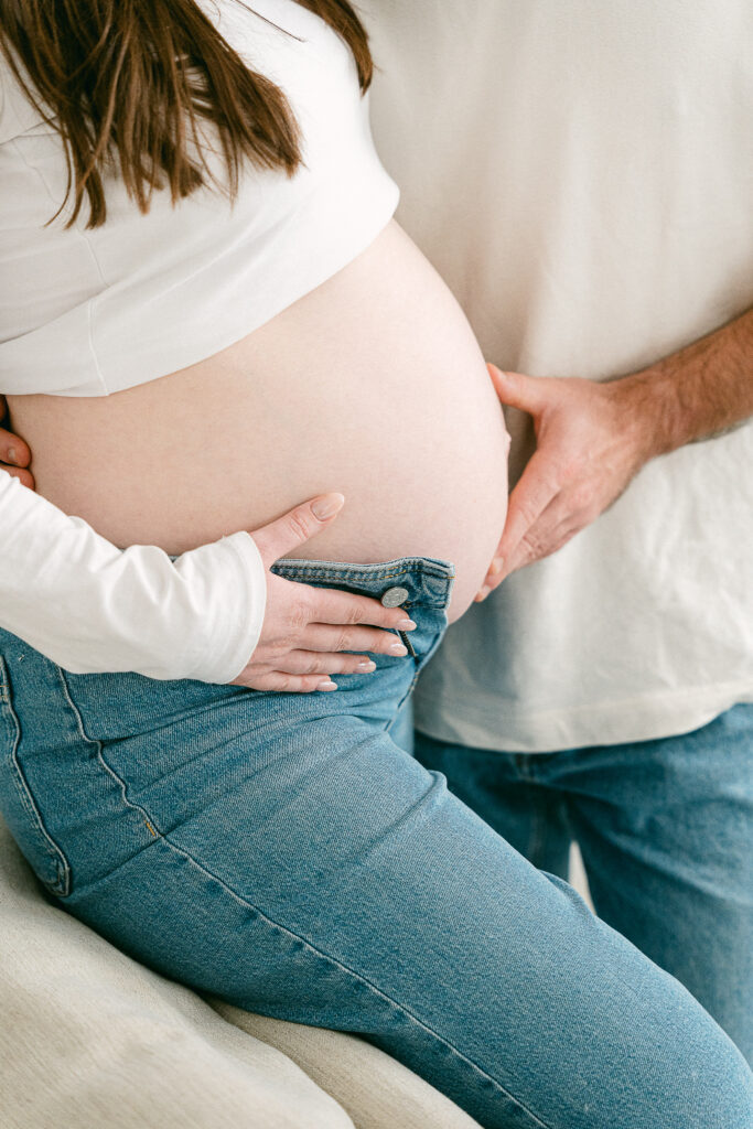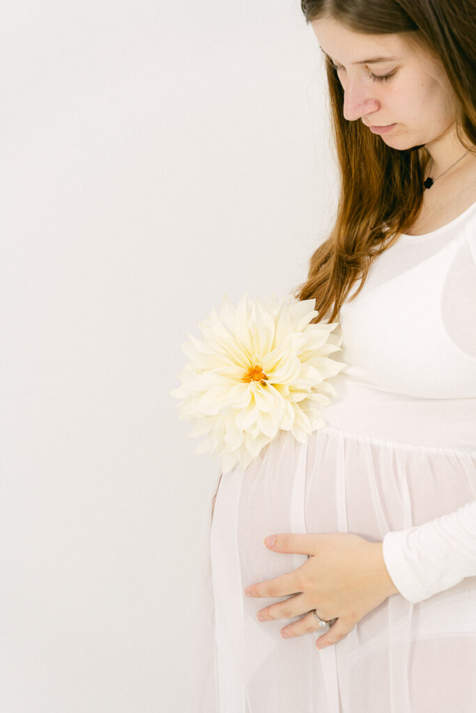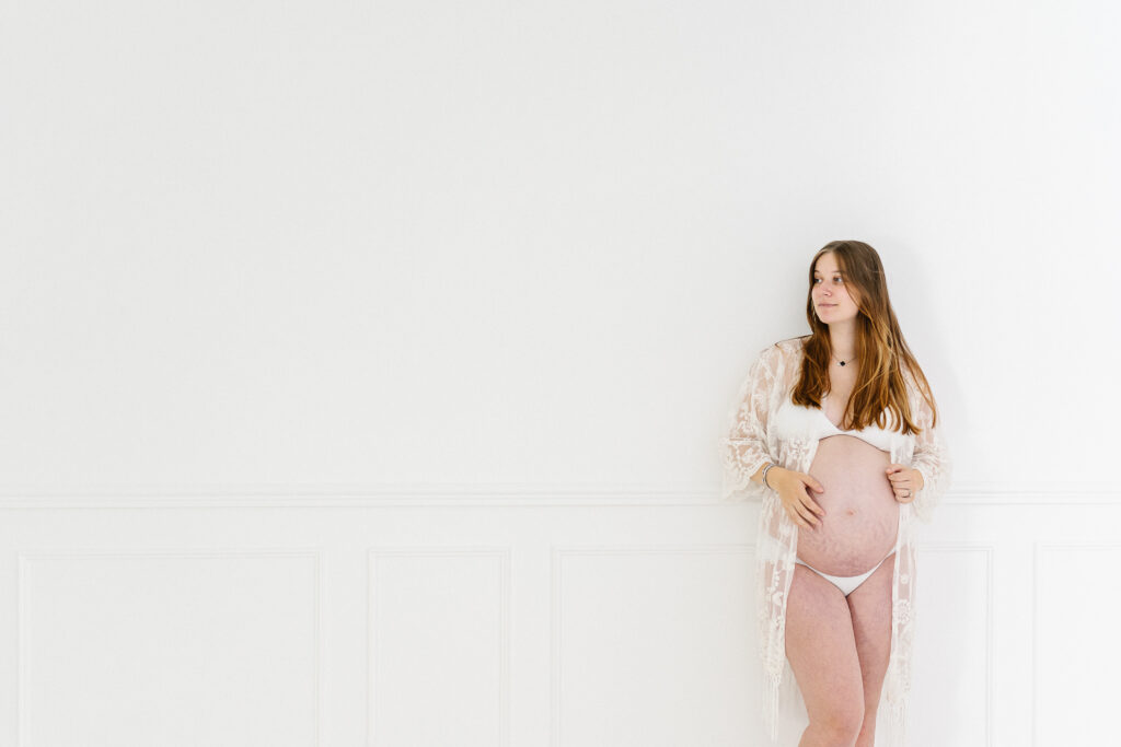 Au studio, les séances photo grossesse sont pensées comme une pause hors du temps, loin du quotidien, pour se reconnecter à soi, à son corps qui change, et à ce lien déjà si fort avec son bébé.