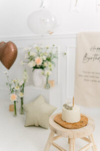 Je vous propose une mise en scène épurée avec des ballons, des fleurs et un gâteau pour un smash the cake plein de douceur.