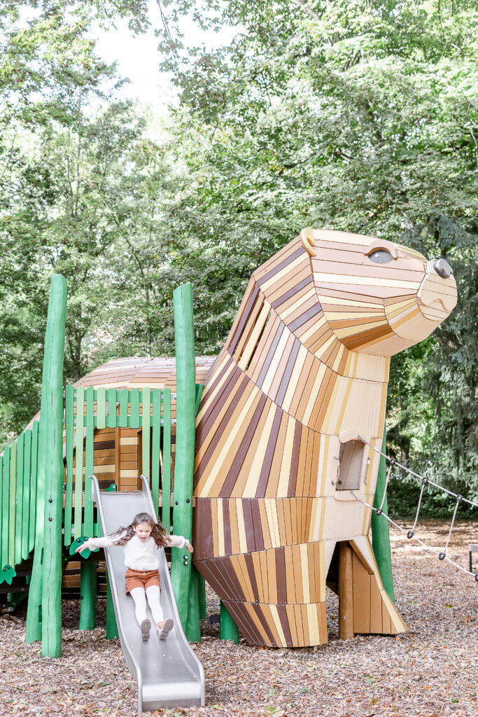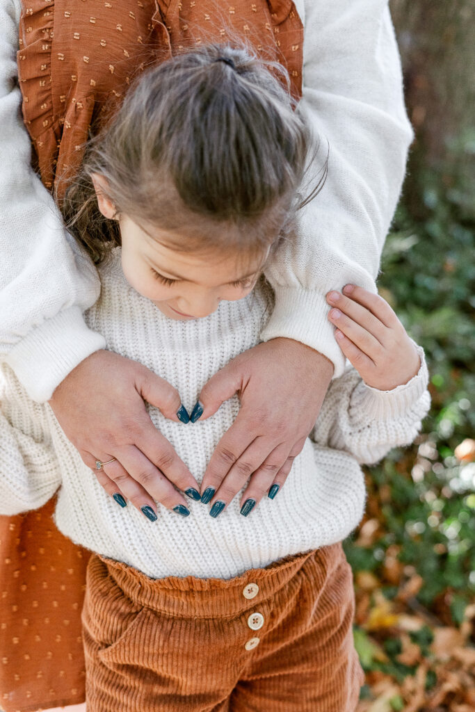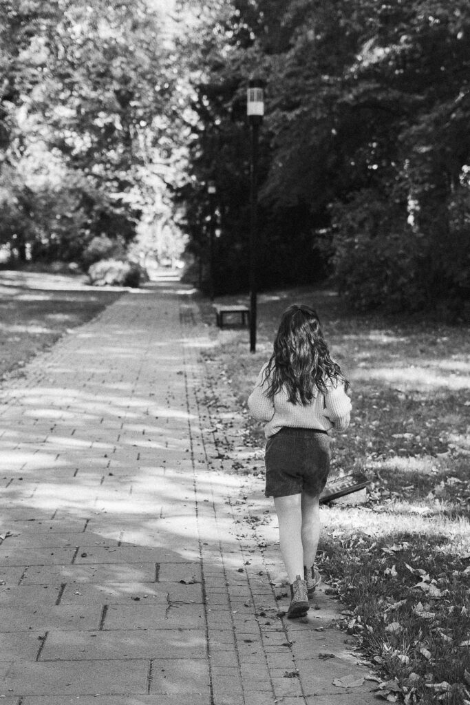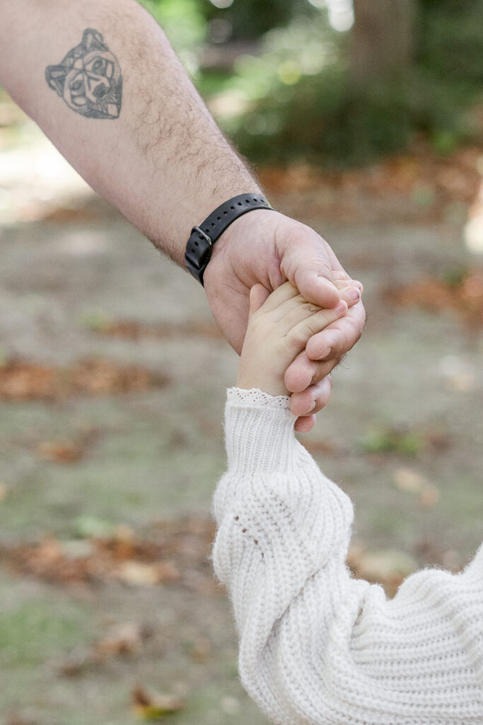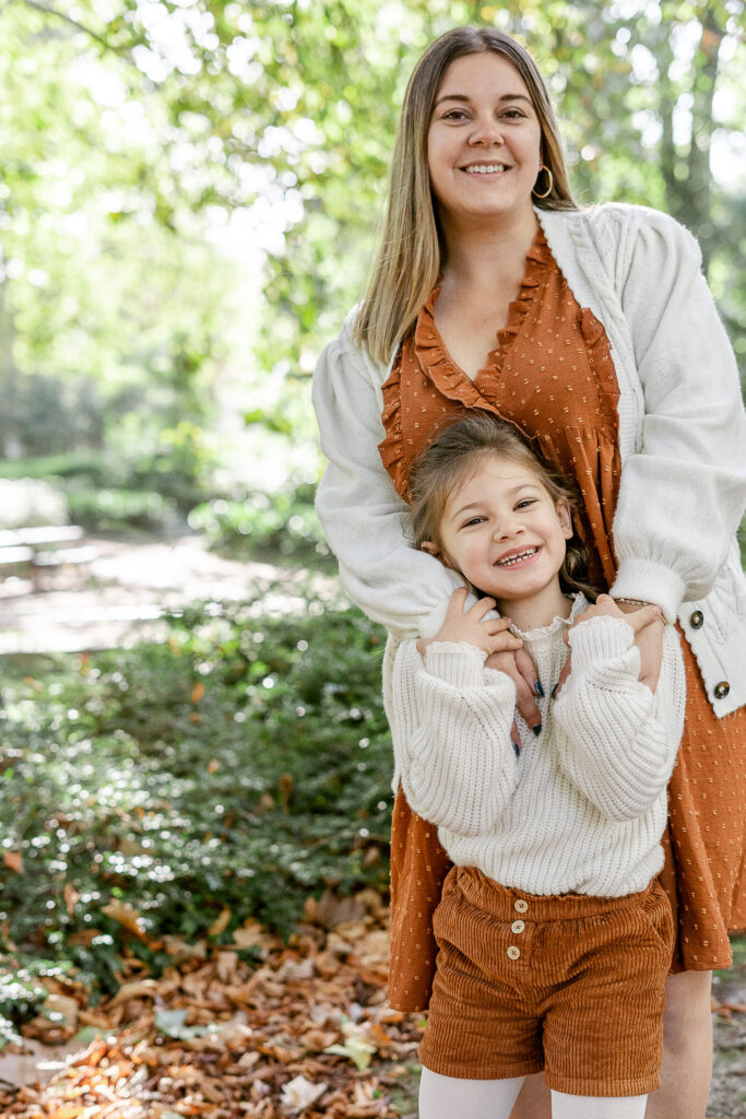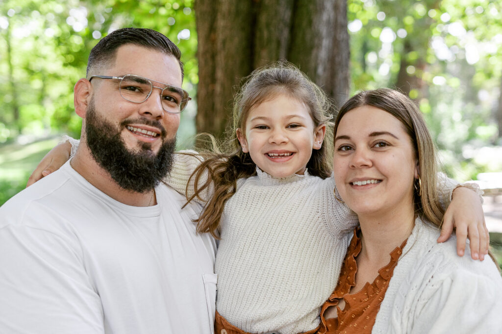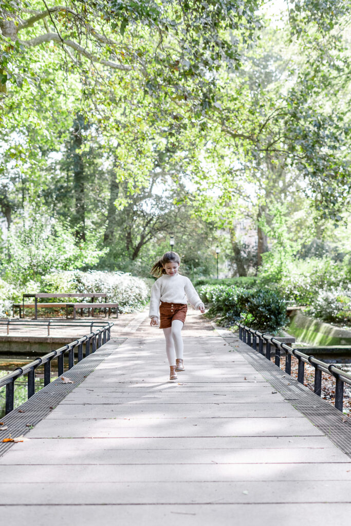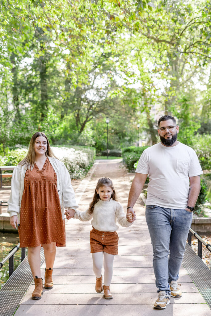 Dès notre arrivée, Léana a commencé à courir entre les arbres, ses petites mains ramassant des feuilles comme des trésors. Jessie et Fred la suivaient de près, riant à chaque petit élan de spontanéité. Nous avons commencé par une balade tranquille, en marchant main dans la main, observant la ville qui s’efface derrière les couleurs de l’automne. Les éclats de rire de Léana résonnaient dans le parc et donnaient tout de suite le ton de la séance : naturel, vivant, plein de complicité.